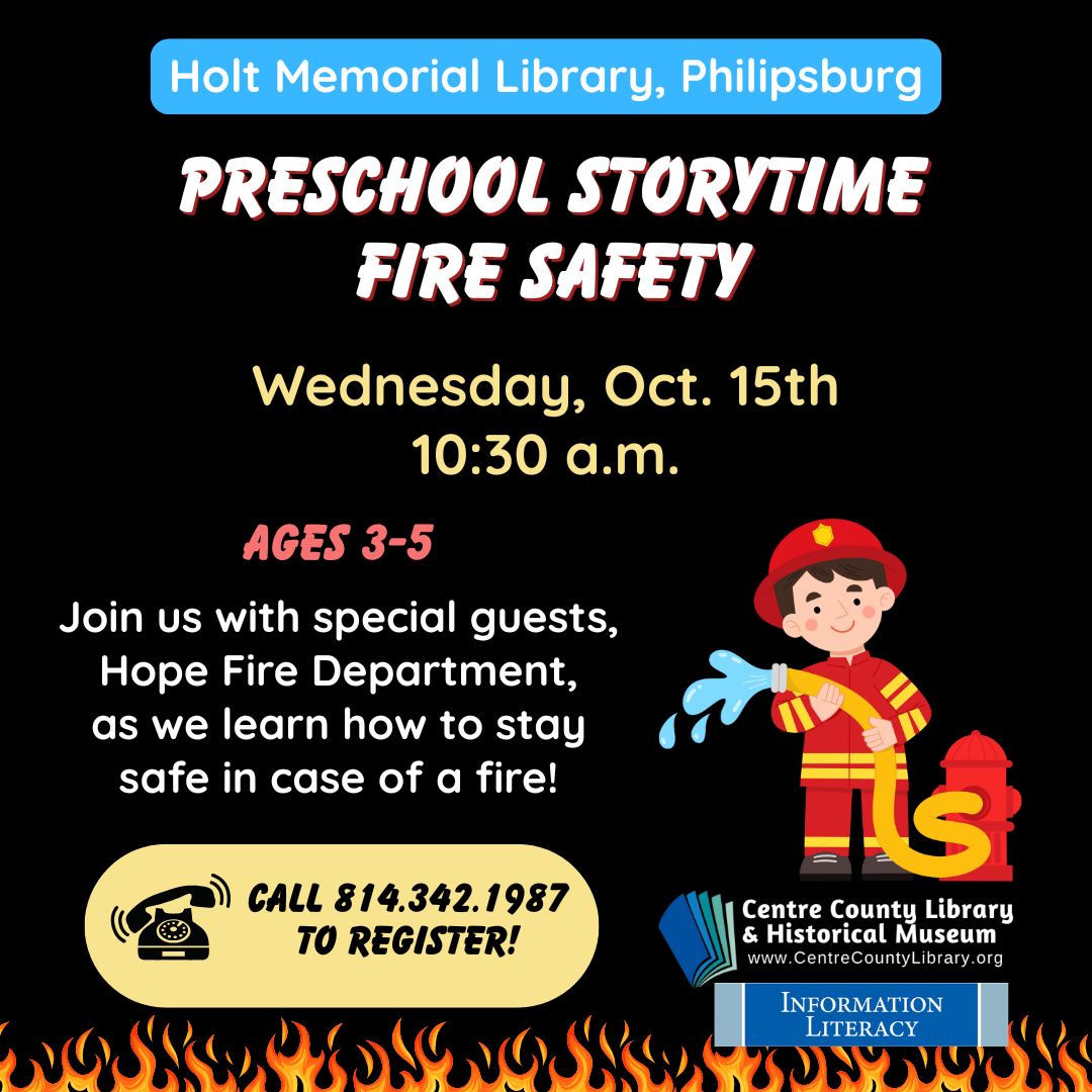 | On Wednesday, Oct. 15th, 10:30 AM, kids ages 3-5 are invited to join us at the library for fun stories, songs, calendar time, crafts and play! This storytime, we’ll have special guests from the Hope Fire Department and learn about fire safety! There is no need to register. |
