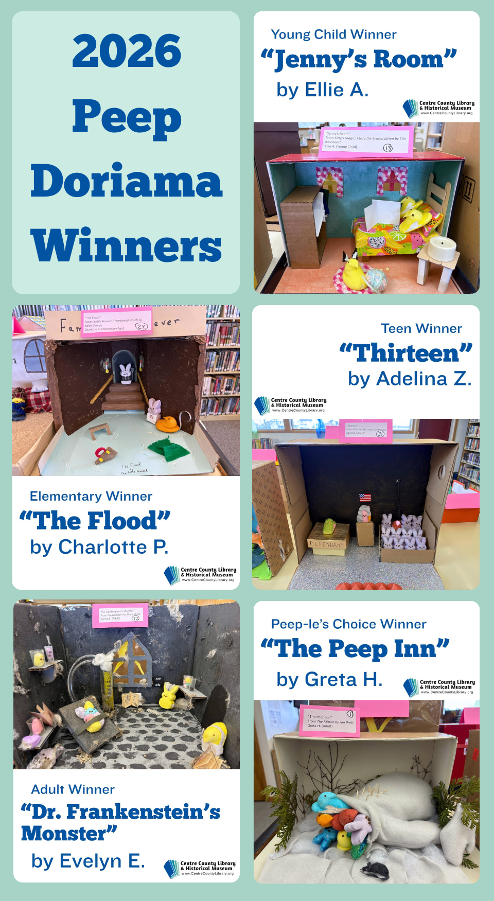 All Peep Dioramas must be picked up from the library by Monday, April 20th at 4 PM. Any remaining dioramas will be thrown away.